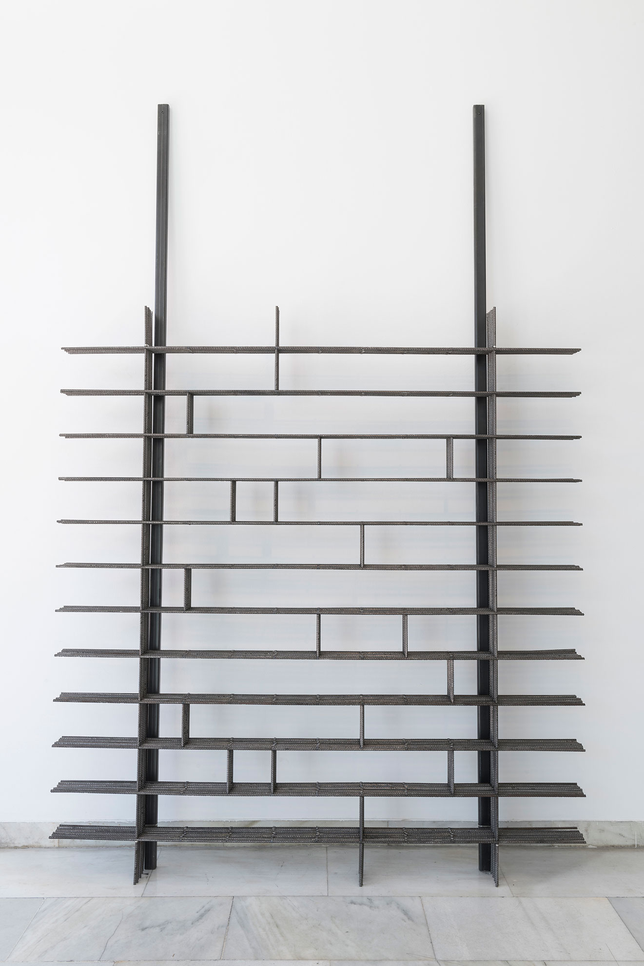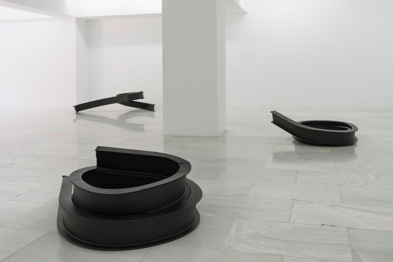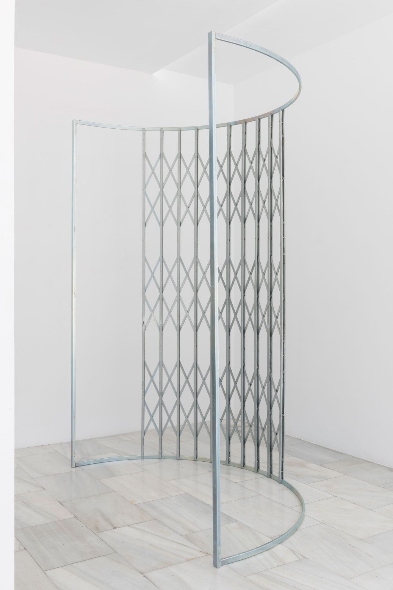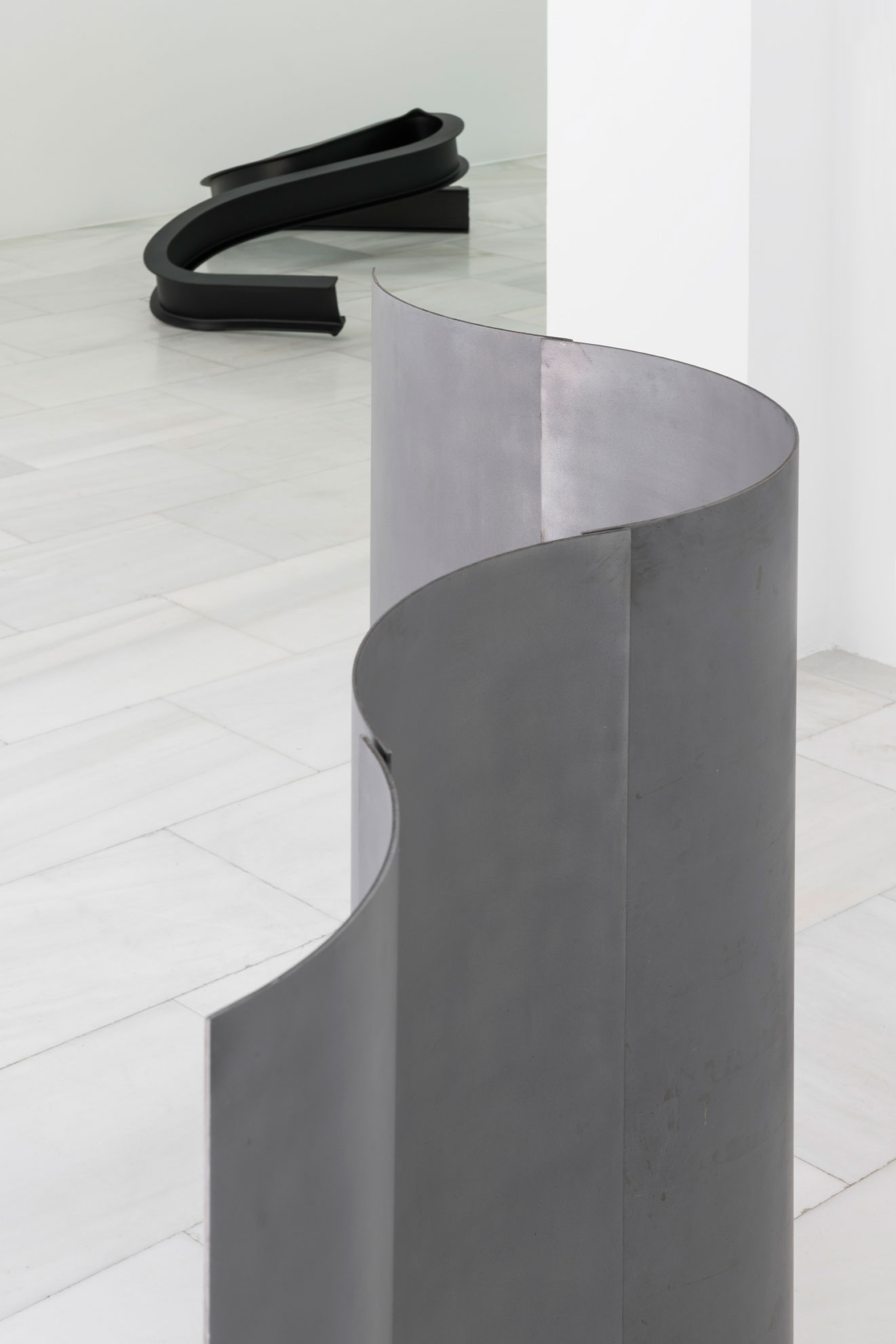 The objects take us back to the bodily experience we have inherited from the streets, and to the visual vocabulary attained from our daily routines in the city. With a second look, the decipherable features of these elements give way to a set of configurations that disrupt their normal “behaviours”. Steel beams swirl on the floor, with a seemingly animalistic temperament1; copper tubes meander through imaginary circuits, undergoing numerous deviations from the routes that would ensure greater effectiveness2; security gates float aery in mid-air, slowly swinging and revolving3; stainless steel handrails are contorted4 and guardrails twitch5. Such standardised elements have acquired unique sculptural qualities, which not only obstruct their original uses, but also emancipate them from the orderly physical and conceptual grids that they are obliged to obey. The original objects were initially designed, calculated and fabricated to fulfil specific roles as a part of wider structures, networks and systems. Their shapes follow pre-defined functions and are fine-tuned in relation to wider spatial hierarchies, rules and purposes. As such, they are intended to fulfil structural or infrastructural roles, to act as mediating devices between citizens and their urban surroundings, or to prevent certain “deviant” and “uncivil” behaviours. In these and other ways, these components not only make up the physical constitution of the city, but also contribute to the materialisation and maintenance of a certain order within it.